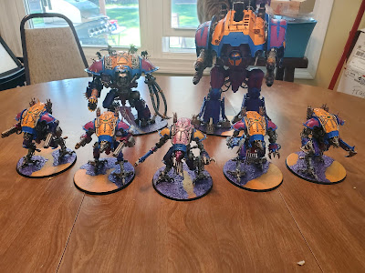 Knight Seneschal: The Midnight Waveshaper - Knight Abominant, Volkite Combuster, Electroscourge, Balemace, Diabolus Heavy StubberKnight Scion: Sunflare Lazerhawk - Acastus Knight Porphyrion - 2x Twin Magna Lascannon, 2x Lascannon, Iron Storm Missle Pod